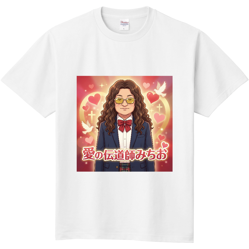 「愛の伝道師みちお」をプリントしたインパクト&効果絶大のTシャツ。